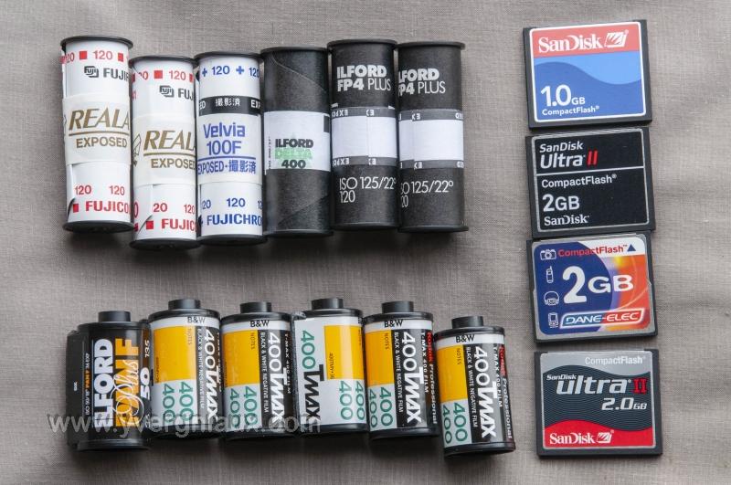 Des film 24x36 noir et blanc pour le Leica, des bobines 120 pour l'Hasselblad et des cartes mémolire pour le Nikon D300