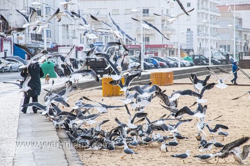 Nazaré (Portugal) 30/12/2009 : Vol de mouettes attirés par un passant qui donne à manger