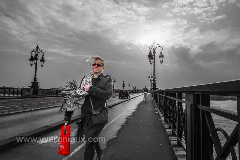 Mots clés : femme fleuve noir-blanc-rouge pont scène de rue vent