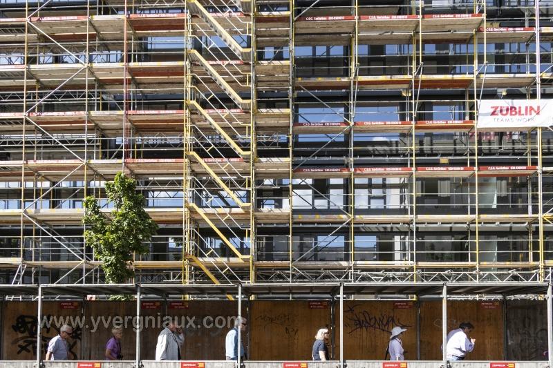 Berlin 05/08/2018 : Des piétons marchent sous un échafaudage.