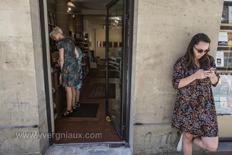 Bordeaux (33) 22/08/2019 Femme et son smartphone à la porte d'une llibrairie.