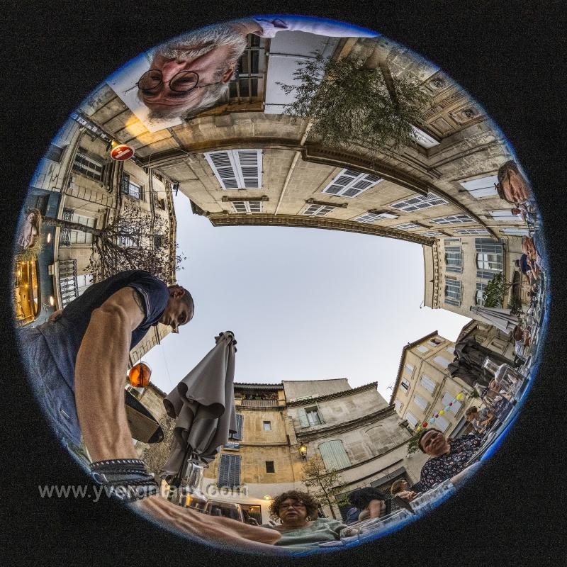 Arles (13) 31/07/2022 : petite place avec terrasse et restaurant. Prise de vue au grand angle.