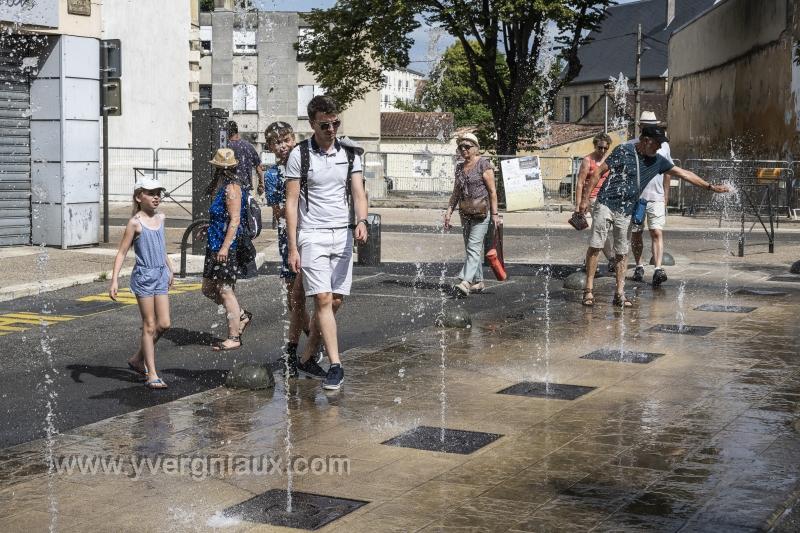 Bergerac (Dordogne) 05/08/2022 : piétons se raffraichissant près des jets d'eau