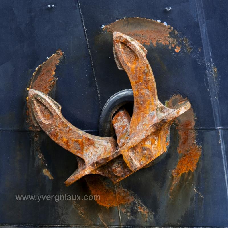 Saint-Malo (35) 12/07/2023 :Le chalutier de haute mer, bateau usine dela Compagnie des Pêche, en cours de maintenance dans le port de Saint-Malo. Ancre du navire.