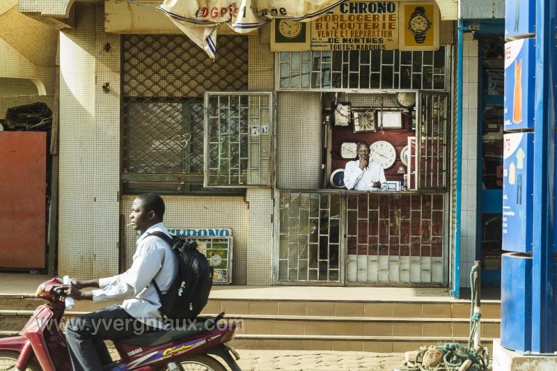 Ouagadougou, (Burkina Faso) mars 2014 : Une moto passe devant la boutique d'un horloger.