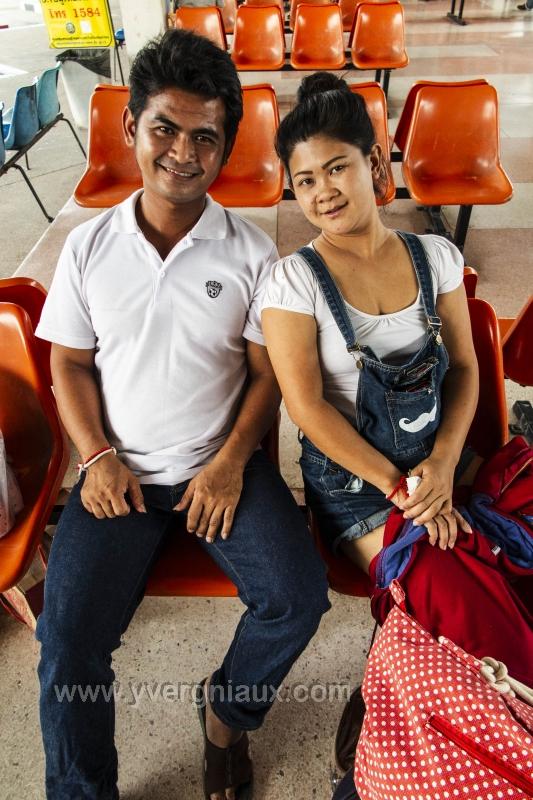 Chiang Rai (Thailand) 20/04/2015 : Attente à la gare routière du bus pour Chiang Mai. un couple prend la pause.