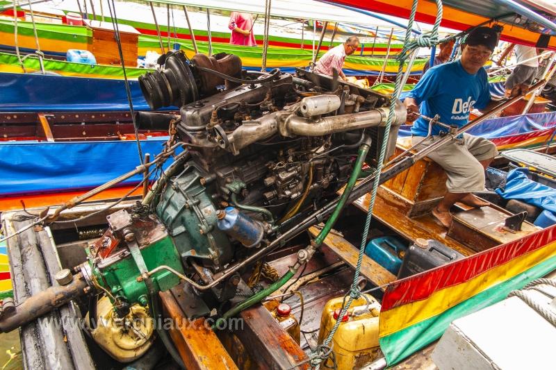 Bankok (Thailand) 27/04/2015 : Marché du dimanche près du restaurant flottant. Manoeuvre des bateaux long tail.