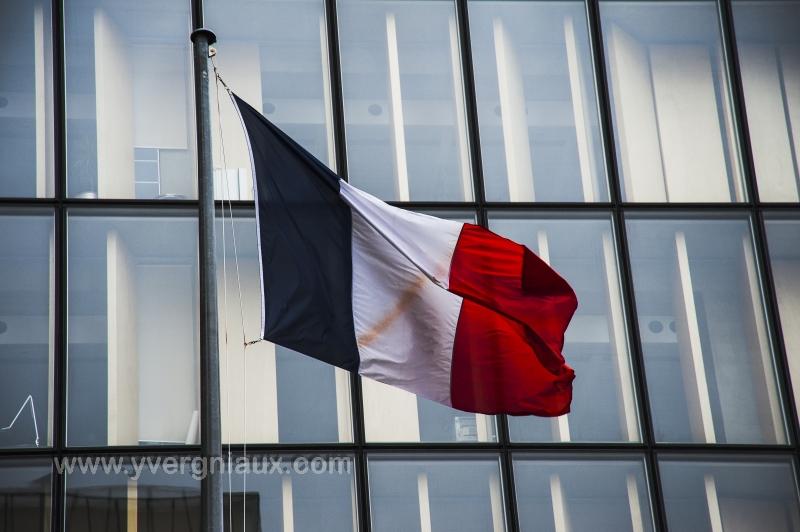 Paris 21/01/2012 : Drapeau fran?ais flottant devant la Biblioth?que Fran?ois Mitterand.