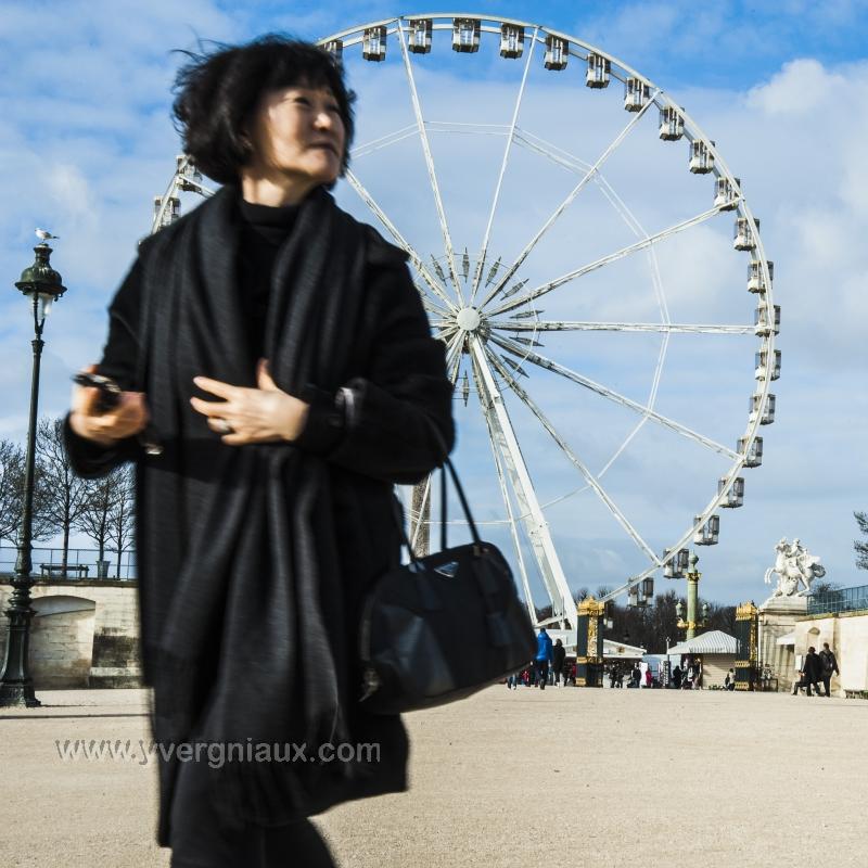 La grande roue de la Concorde. Femme ? l'appareil photo.