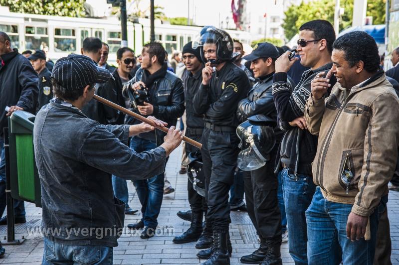 Tunis 07/04/2012 : Manifestation des dipl?m?s au ch?mage le 7 avril 2012. musicien devant les forces de l'ordre.