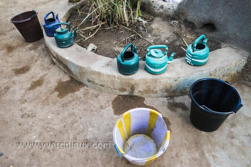 Boromo (Burkina Faso) mars 2014 : L'h?tel des voutes nubiennes. Construction en terre de fa?on ?cologique. Un seul point d'eau pour tout l'h?tel. Les pots ? eau ? la disposition des clients pour les toilettes.