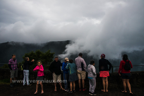 Piton de la Fournaise (R?union) mai 2014 : La route qui monte vers l'Enclos par temps de pluie. Groupe de touristes