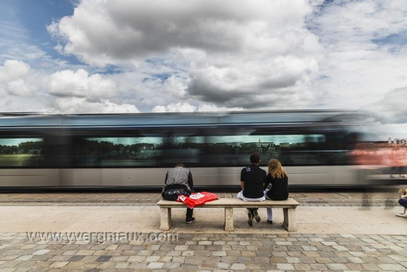 Bordeaux (33) 7/08/2014 : Passage du tramway . Paysage urbain en pose longue.