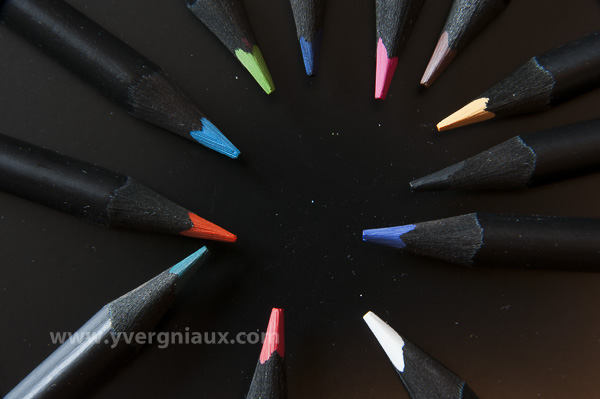 Composition avec des crayons de couleur. Utilisation d'un objectif macro.