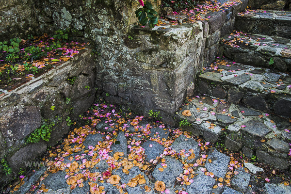 Plou?r sur Rance (22) 29/03/2017 : Fin de floraison du cam?lia. Les p?tales tombent sur la terrasse.