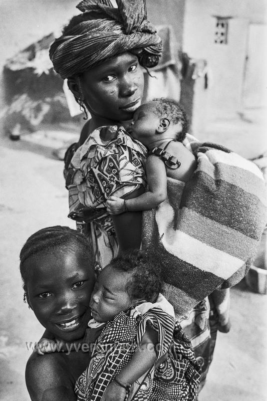 Mopti (Mali) f?vrier 2000 : une femme pose avac ses enfants dans un village de p?cheur bozo au bord du Niger.