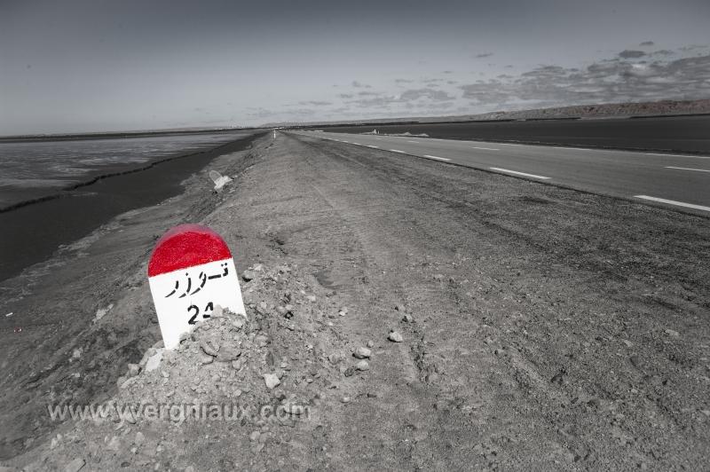 Mots clés : Afrique borne désert noir-blanc-rouge paysage route