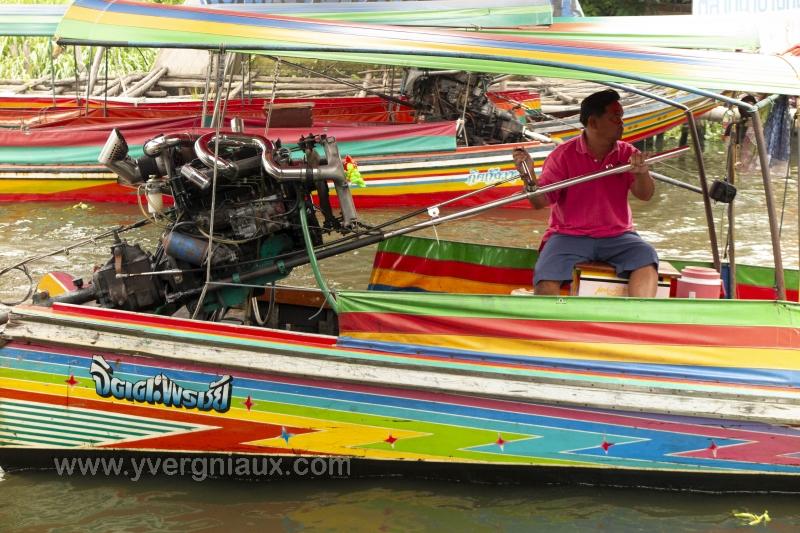 Bankok (Thailand) 27/04/2015 : Marché du dimanche près du restaurant flottant. Manoeuvre des bateaux long tail.